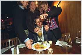 Gutta sleit i biffen, prøvde å stikke av med tallerkenen og dynket veteranen med halvliteren.
